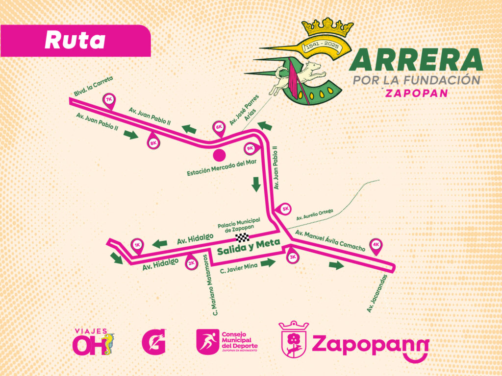 • Salida en Av. Hidalgo # 151, Colonia Centro, Zapopan, Jalisco recorrerán dicha avenida rumbo al lienzo charro la Generala, darán vuelta en “U” para regresar sobre la misma Av. Hidalgo, llegarán a la calle Matamoros y darán vuelta a la derecha hasta la calle Gómez Farías, dando vuelta a la izquierda y continuando por la calle Javier mina cruzando Av. de las Américas darán vuelta por la lateral de Av. Ávila Camacho hasta llegar a calle Jacarandas donde darán vuelta en “U” para retomar Av. Ávila Camacho donde ingresan por el túnel que nos conecta con Av. Juan Pablo II, avanzando sobre la misma y cruzaran a la altura del mercado del mar, la calle el vigía, hasta llegar a la calle Plata, donde se dará vuelta en “U” sobre Av. juan Pablo II, cruzando las calles antes mencionadas; Al llegar a la altura de calle Sta. Lucia nos saldremos a la lateral de Av. Juan Pablo II, dando vuelta a la derecha en Av. Hidalgo hasta llegar al #151 de la misma, en donde se encuentra el arco de salida y Meta.