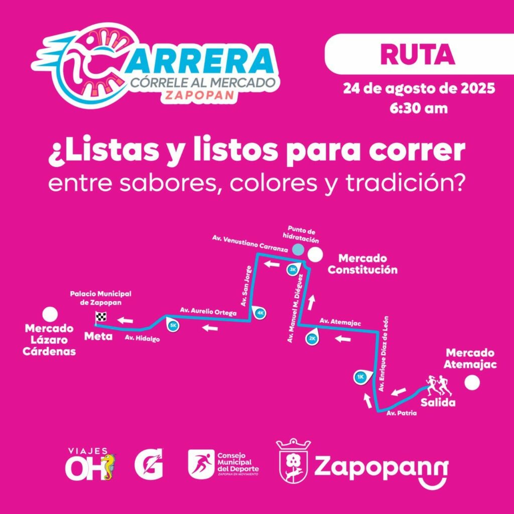 Zapopan te invita a ponerte los tenis, llenar de energía nuestras calles y sumarte a una experiencia única que combina deporte, tradición y comunidad. La carrera pedestre “Córrele al Mercado” forma parte del Serial de Carreras para Todas y Todos 2025 y tiene como misión impulsar el comercio local, recorriendo una ruta que conecta mercados emblemáticos y el corazón de nuestra ciudad.